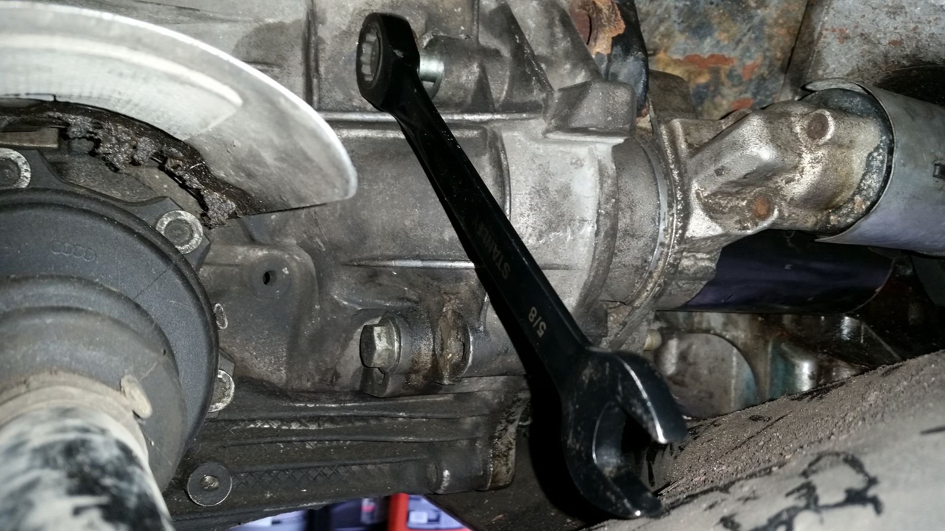 5. Now that the bottom bolt is removed it’s time to start on the top bolt. To get enough torque on this bolt to break it free, I went through the passenger wheel area and interlocked two wrenches together to create more of a lever action. After breaking the bolt free I used a 5/8” ratcheting wrench to remove it but it could just as easily be done with something else.