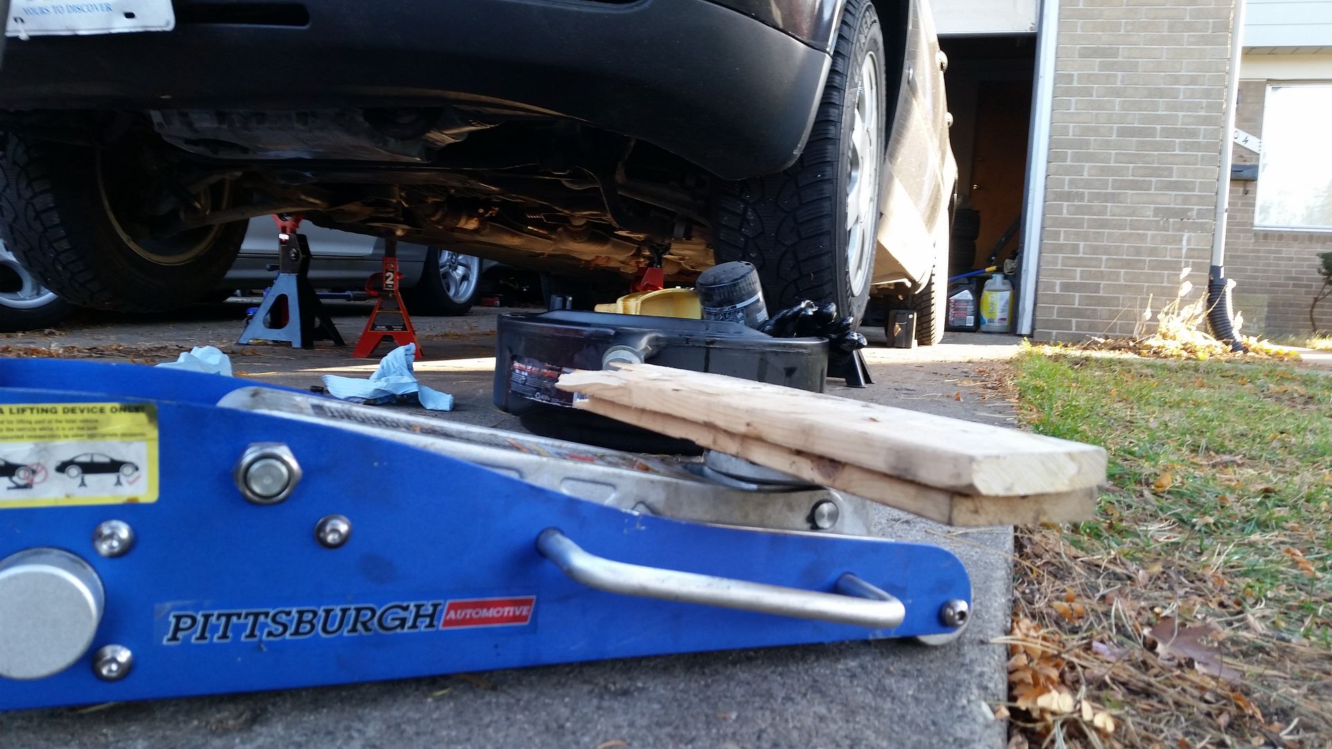 1. Disconnect vehicle battery, crack front passenger wheel bolt, properly lift front of vehicle and secure on jack stands. (My personal vehicle lifting and supporting setup at bottom).
