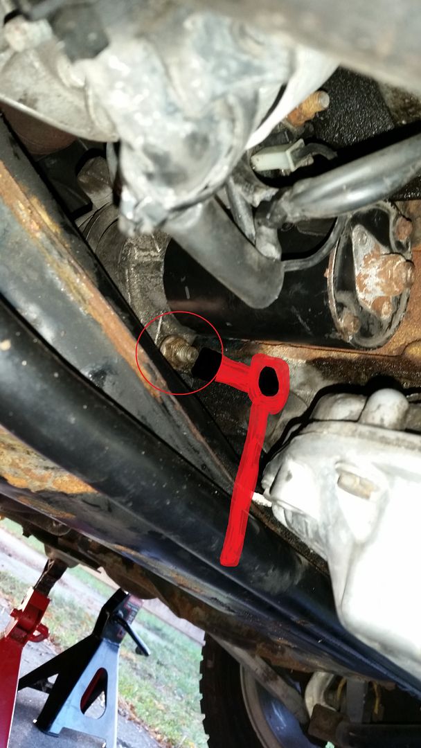 2. Removed the four bolts securing the sway bar and let it swing out of the way for now. The subframe directly behind the roll bar, highlighted in blue, is where I jack my car up from with a couple of 1x4s or so.