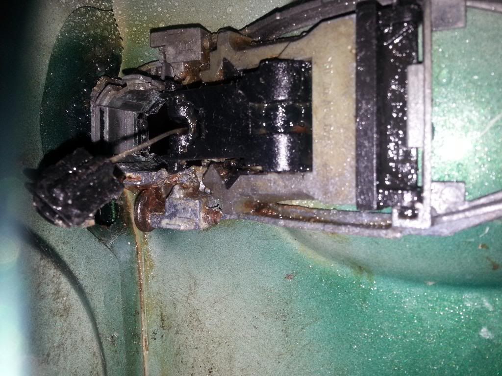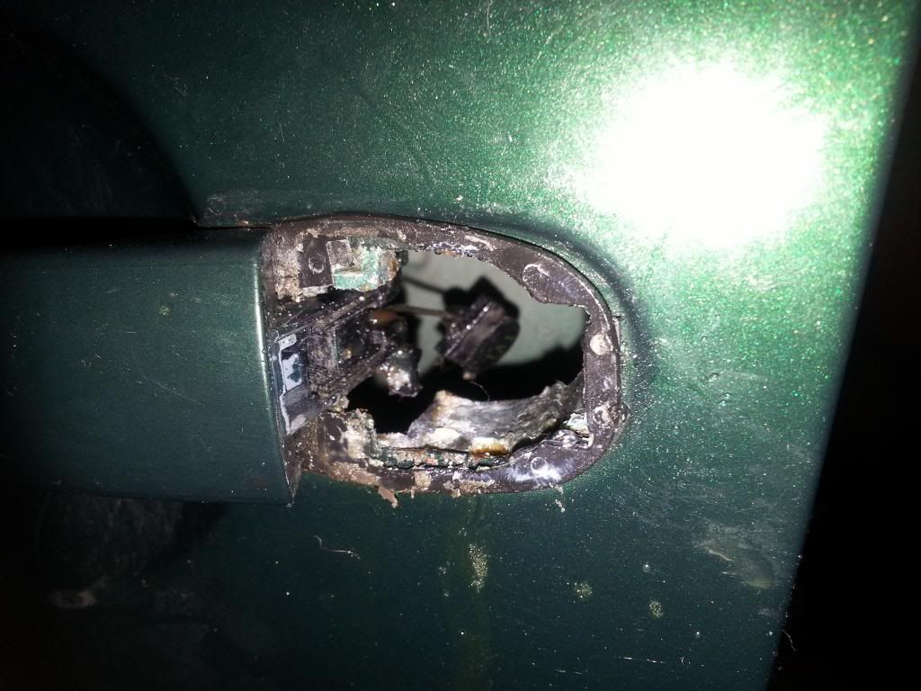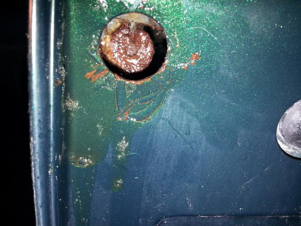 I then removed the inner door panel and metal frame to expose the backside of the screw. You can see it in the following photo: