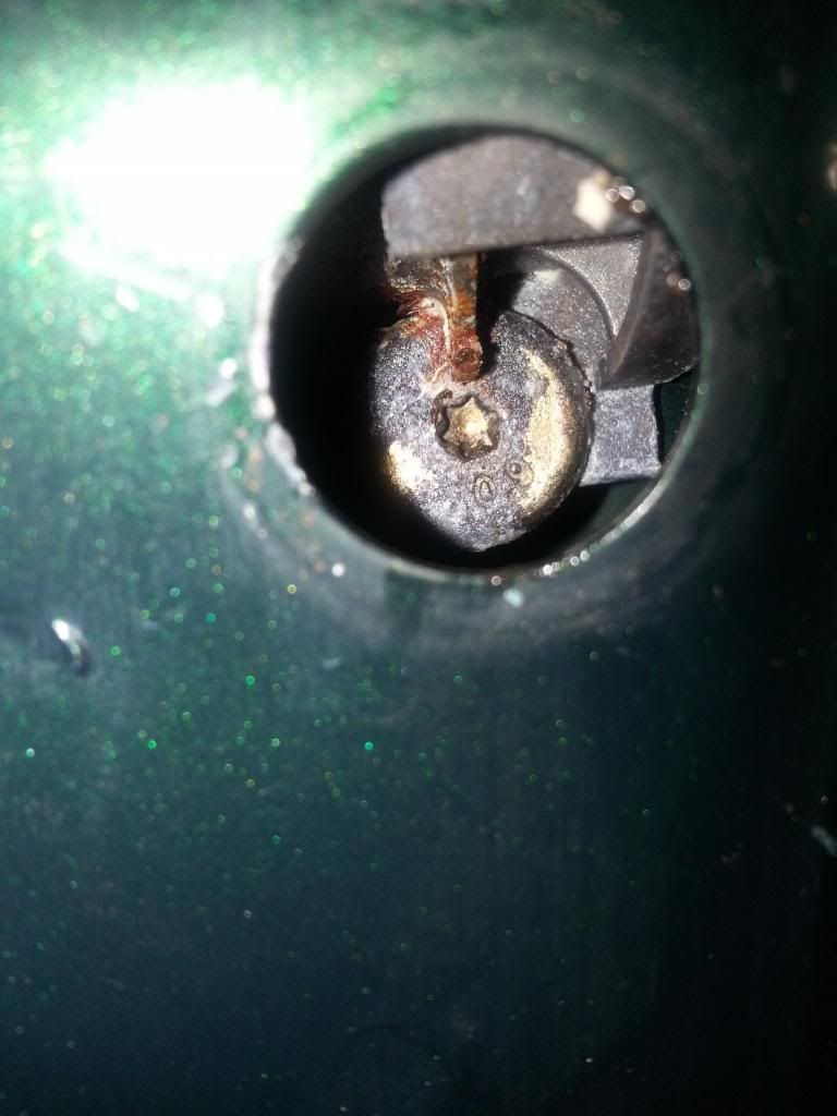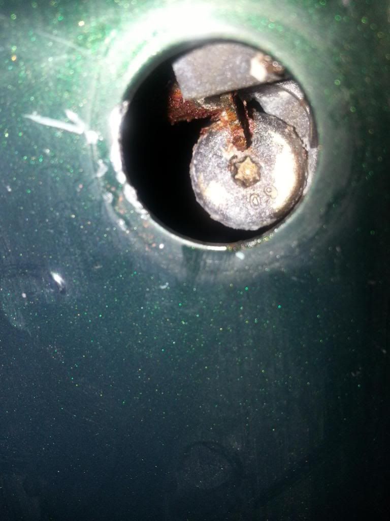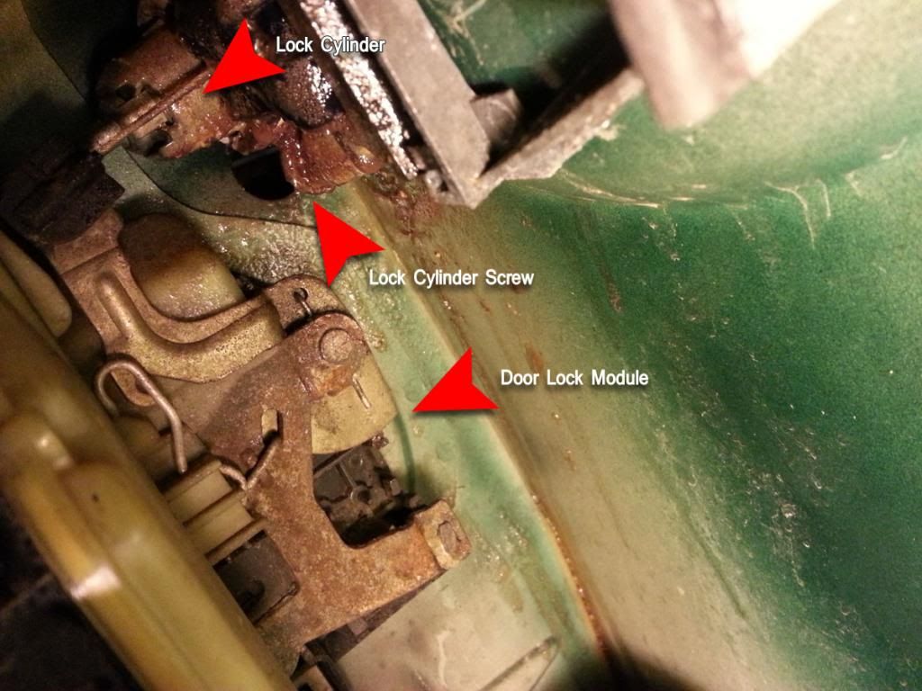 According to the previous owner, he never locked his door supposedly only relying on the remote locking. I figured the issue then could be with the lock cylinders (tumblers?). I exposed the hole on the side of the door leading to the door lock cylinder screw and tried turning it. IMPOSSIBLE. It looks and feels rusted tight.